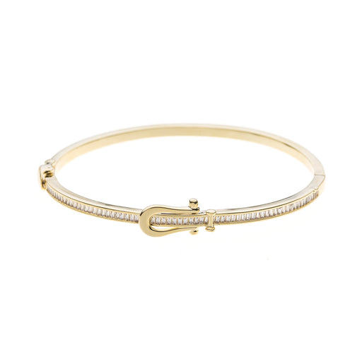 Add some sparkle to your look with our gold plated bangle with cubic zirconia stones. Elevate your style with ease. Supplied with a complimentary g...