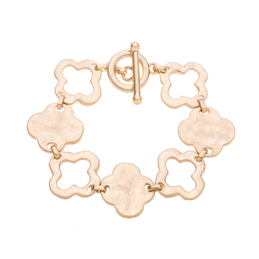 This clover bracelet is gold plated with a stylish t-bar clasp. Supplied in a pouch on a hanging card.