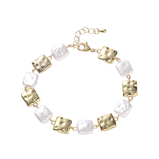 Elevate your style with our gold plated bracelet with alternating gold and pearl square pendants. Transform your look with ease. Supplied with a co...