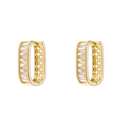 Capture attention with our beautiful gold plated squared hoop earrings with cubic zirconia stones. Add some sparkle to your look. 22mm. Supplied wi...