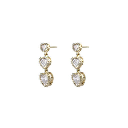 Add some sparkle to your look with our gold plated hanging heart trio earrings with cubic zirconia stones. Elevate your style with ease. 25mm drop....