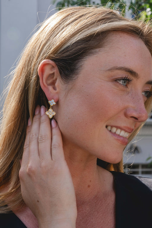 Add some sparkle to your look with our gold plated detailed hanging trio earrings. Effortlessly elegant. 37mm. Supplied with a complimentary gift ...