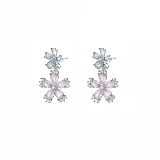 Elevate your style with our rhodium plated intricate flower duo earrings, with pink and blue cubic zirconia detailing. Add some sparkle to your loo...