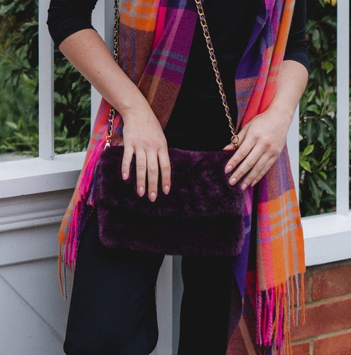 Elevate your look with our stylish and soft faux fur deep purple bag. Coordinate your look with matching accessories. Other colours available. 20 ...