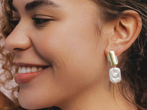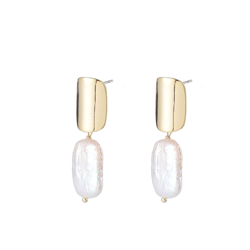 Add a touch of elegance with our gold plated rectangular stud earrings with hanging freshwater pearl pendant. The perfect addition to any look. 37m...
