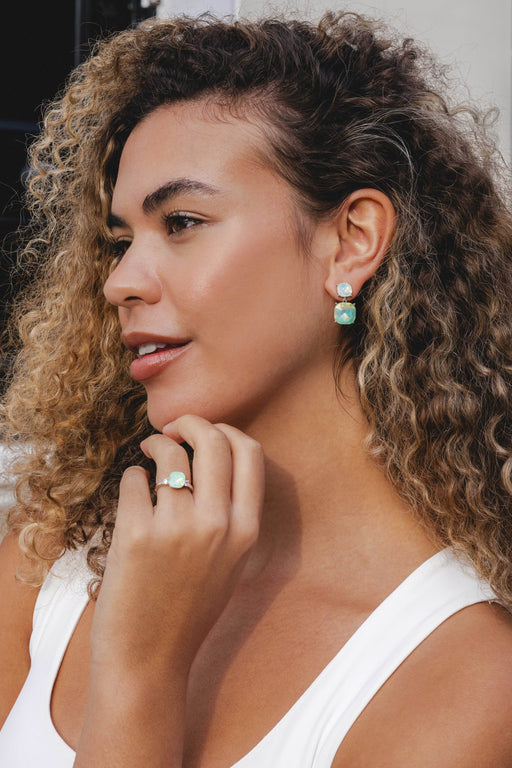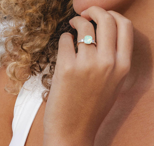 Capture attention with our rhodium plated ring with turquoise cubic zirconia stones. Add a touch of sparkle to your look. Adjustable sizing. Suppli...